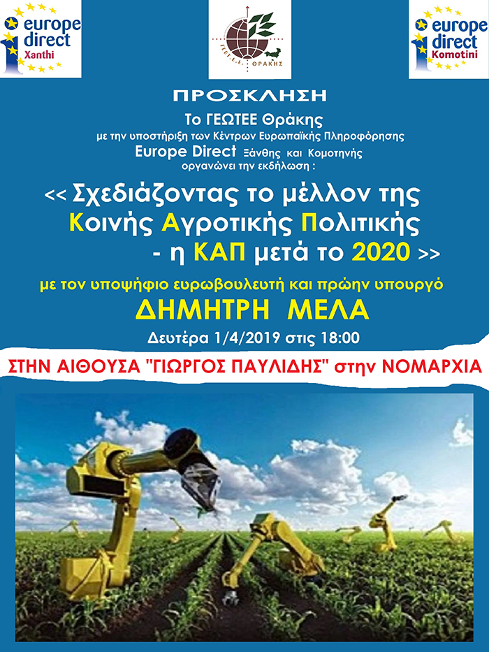 Νέα - ΠΡΟΣΟΧΗ- ΑΛΛΑΓΗ ΑΙΘΟΥΣΑΣ - ΠΑΡΑΡΤΗΜΑ ΘΡΑΚΗΣ: ΕΚΔΗΛΩΣΗ «ΣΧΕΔΙΑΖΟΝΤΑΣ ΤΟ ΜΕΛΛΟΝ ΤΗΣ ΚΟΙΝΗΣ ΑΓΡΟΤΙΚΗΣ ΠΟΛΙΤΙΚΗΣ- Η ΚΑΠ ΜΕΤΑ ΤΟ 2020» (ΚΟΜΟΤΗΝΗ, 1/4/2019)